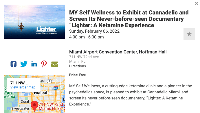 This is what the media coverage had to say: "MY Self Wellness, a cutting-edge ketamine clinic and a pioneer in the psychedelics space, is pleased to exhibit at Cannadelic Miami, and screen its never-before-seen documentary, "Lighter: A Ketamine Experience." MY Self Wellness exists to assist and empower...